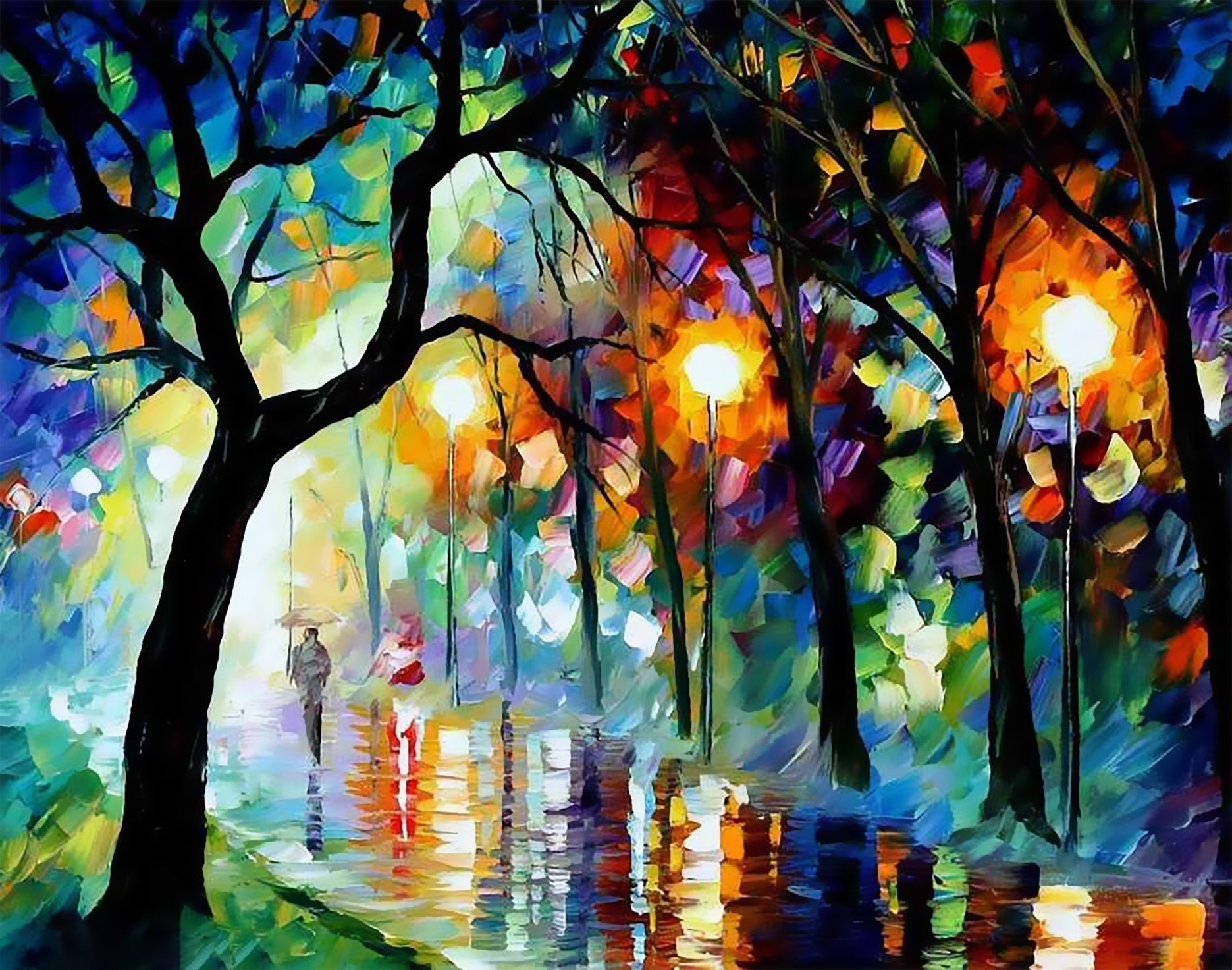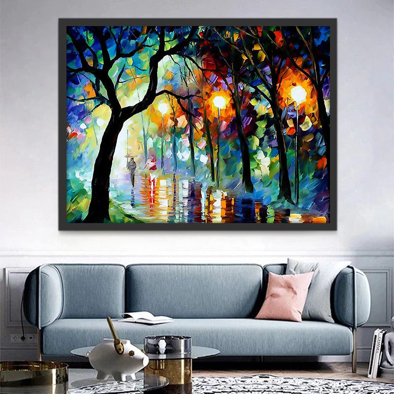 Voetgangers onder de Kleurrijke Bomen op een Regenachtige Avond Schilderen op Nummers