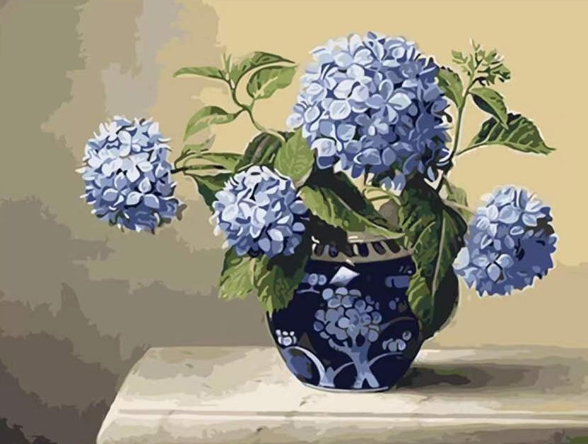 Blauwe porseleinen vaas met blauwe hortensia's Schilderen op Nummers