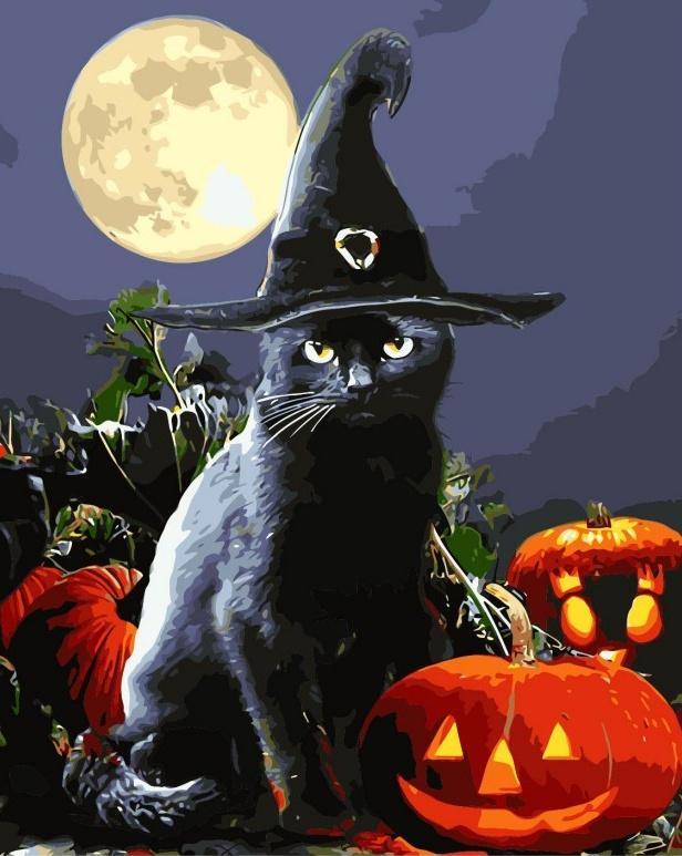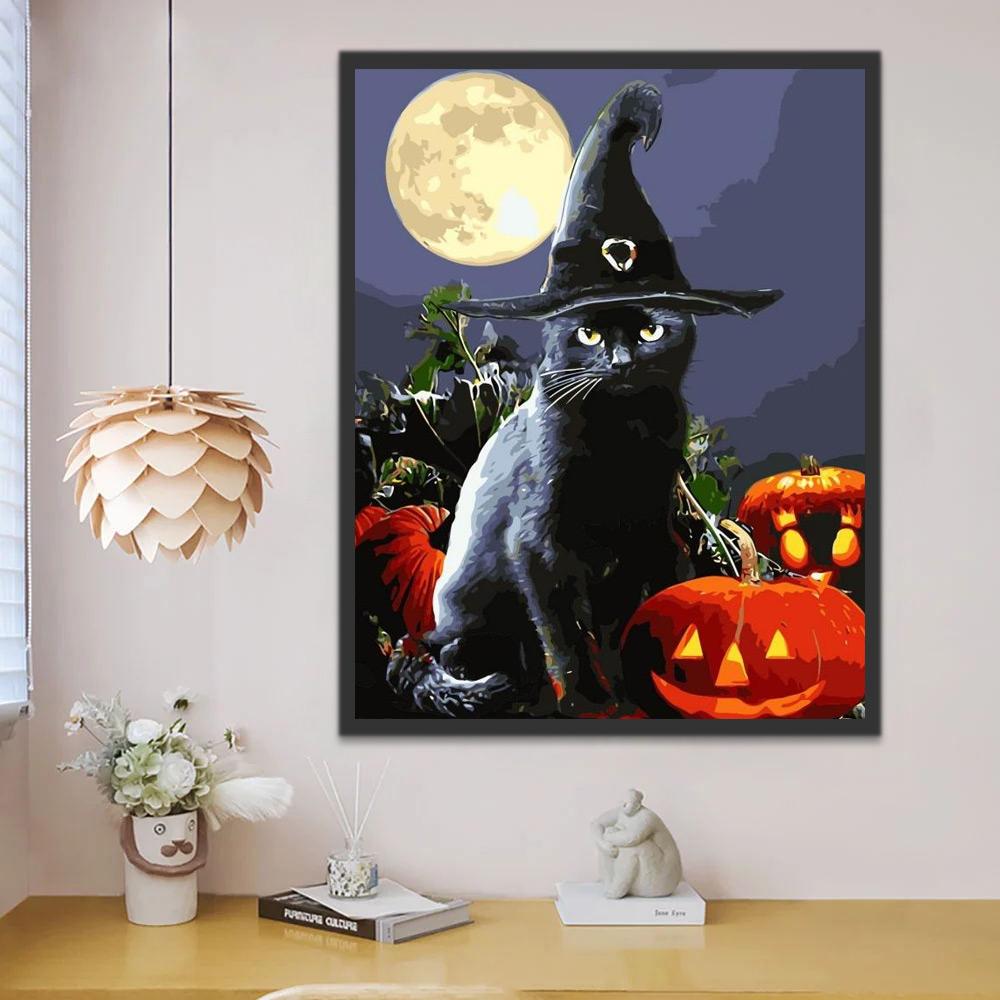 Zwarte Kat met Gele Ogen, Pompoen en Maan Schilderen op Nummers