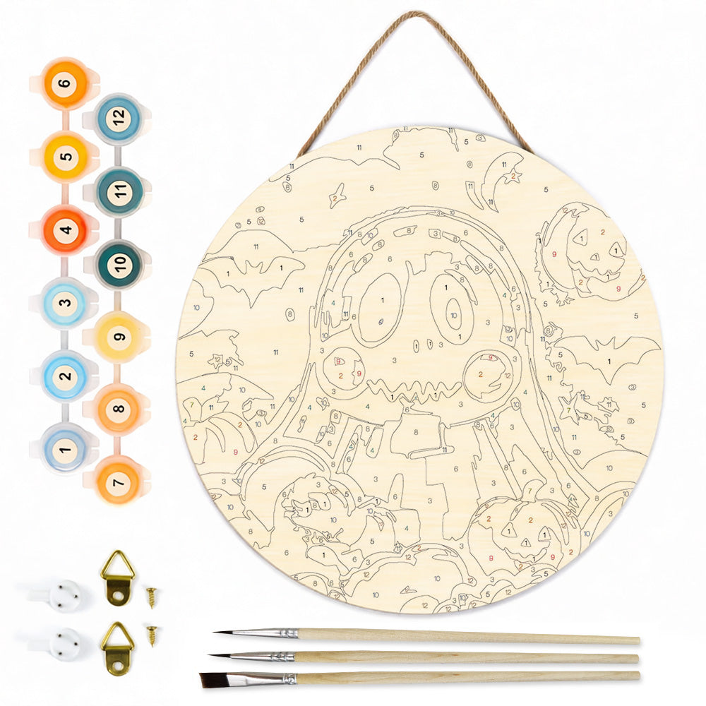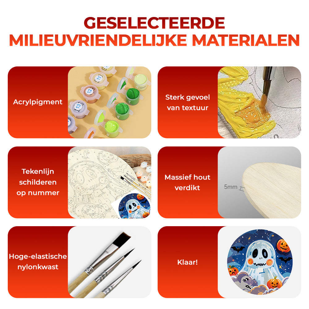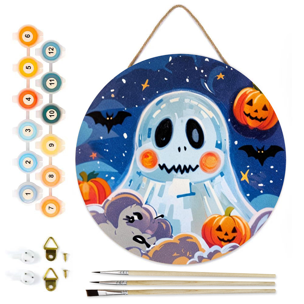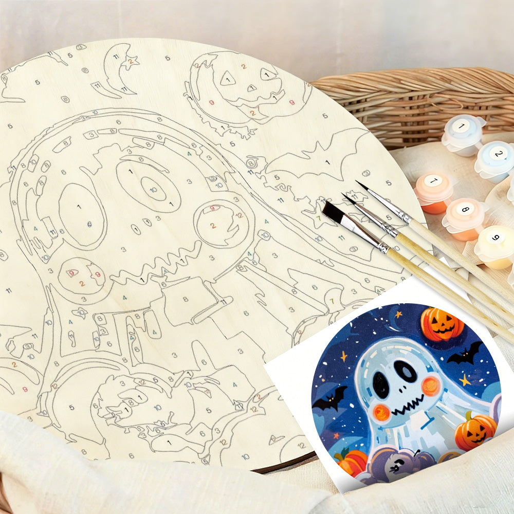 Houtschijf Schilderen op Nummers - Schattige Halloween Geest en Pompoenlantaarns