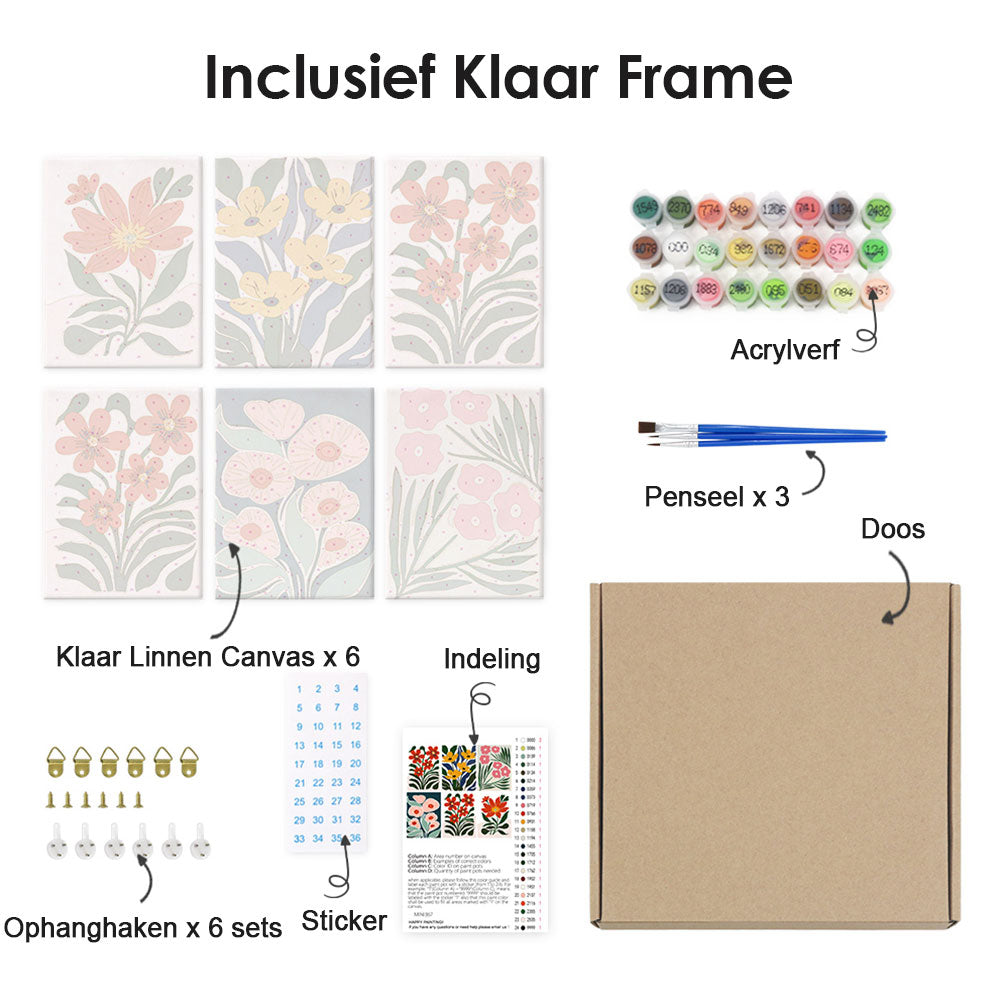 Felgekleurde Bloemen tussen Groene Bladeren 6 Stuks Mini Schilderen op Nummers
