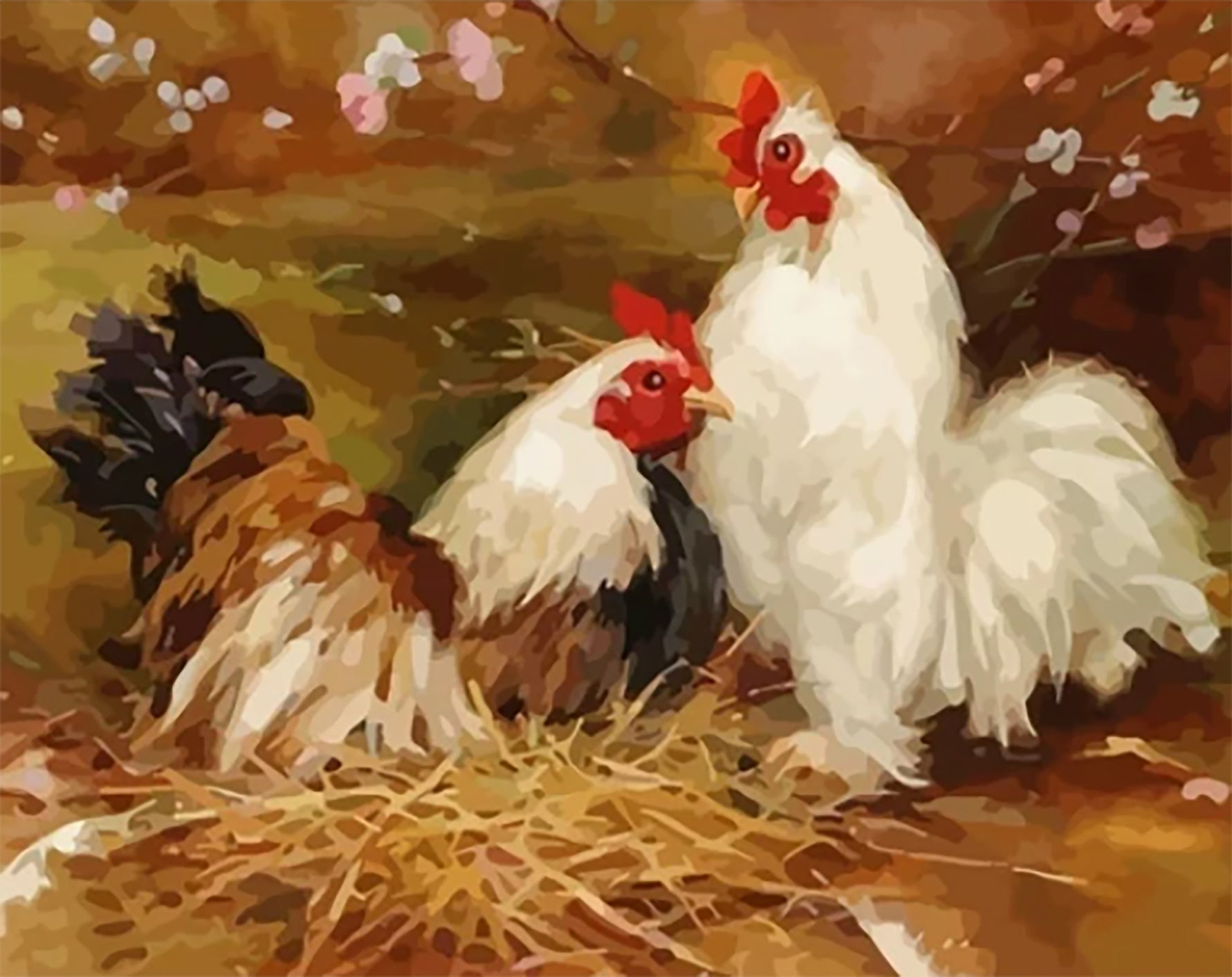 Haan en kip onder de bloemenboom Schilderen op Nummers