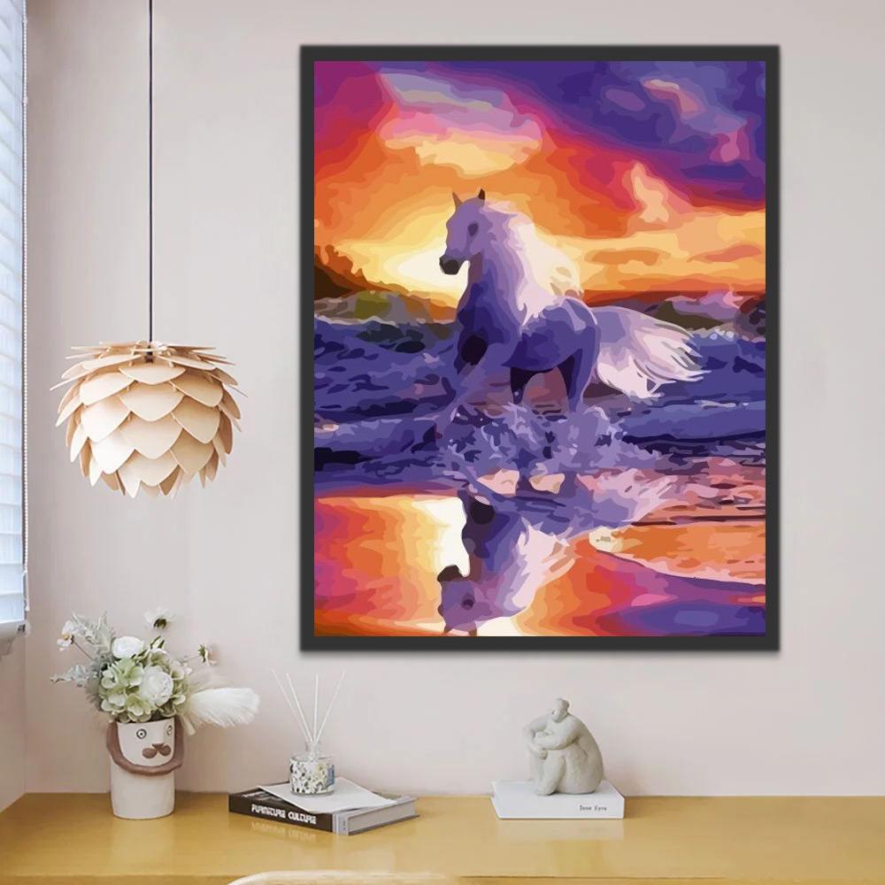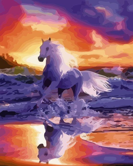 Wit Paard op Strand bij Zonsondergang Schilderen op Nummers