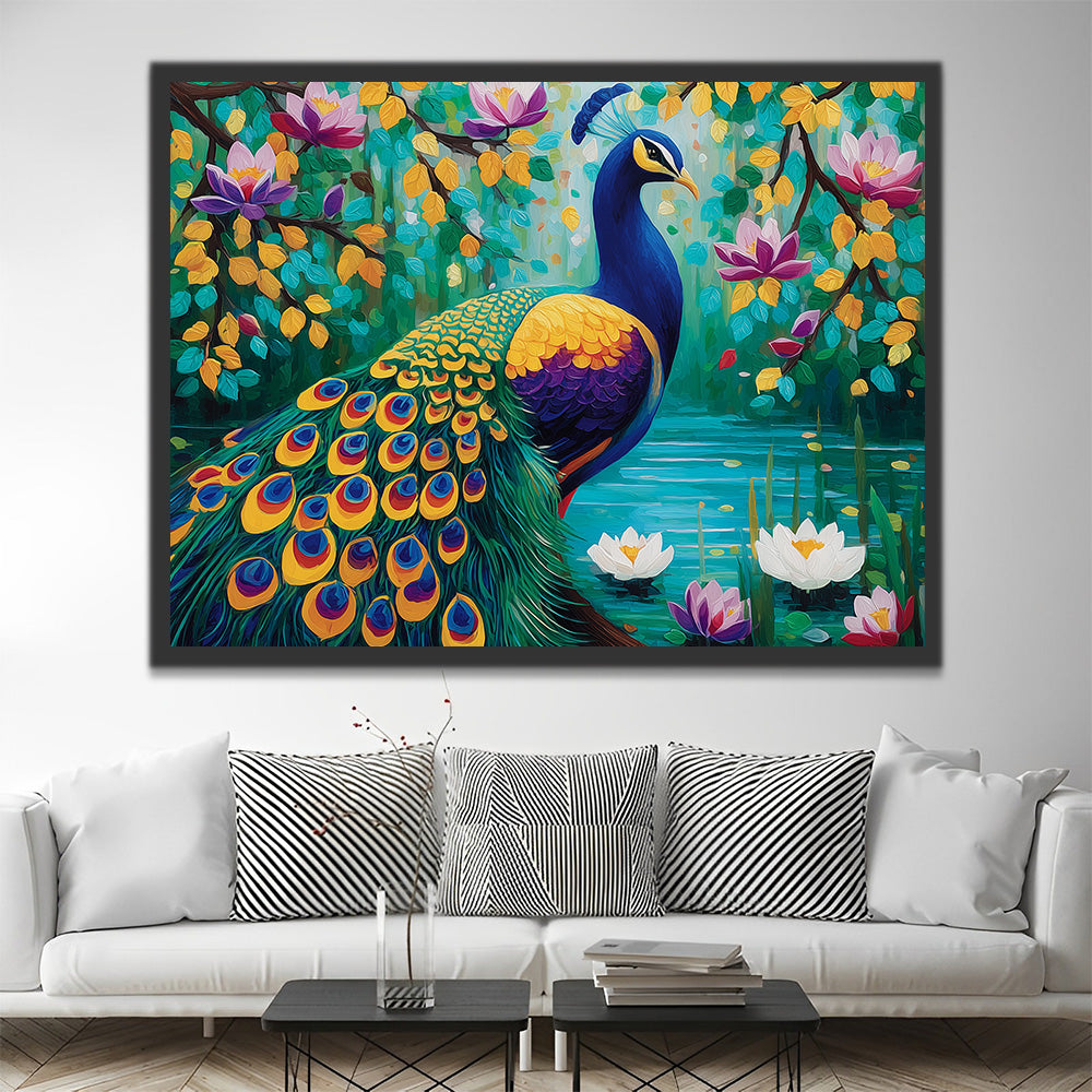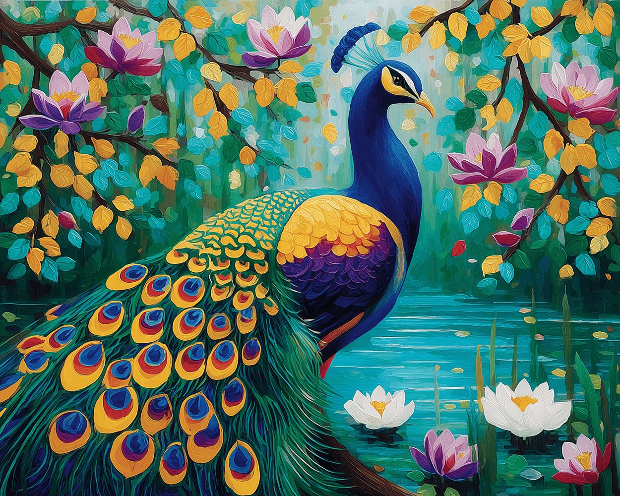 Goudgroene Pauw naast een Lotusbloemenvijver Schilderen op Nummers