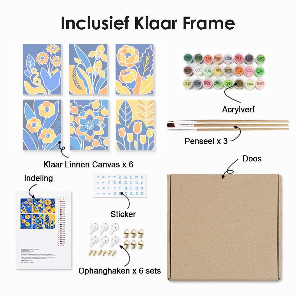 Gele Bloemen op een Blauwe Achtergrond 6 Stuks Mini Schilderen op Nummers