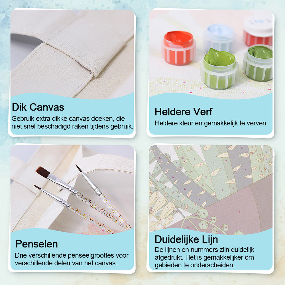 Gemakkelijk te schilderen - De set van Schilderen op nummers is gemakkelijk te gebruiken. Elk deel van het canvasdoek is genummerd en komt overeen met een kleur. Volg de instructies, schilder op nummer en maak de afbeelding af.