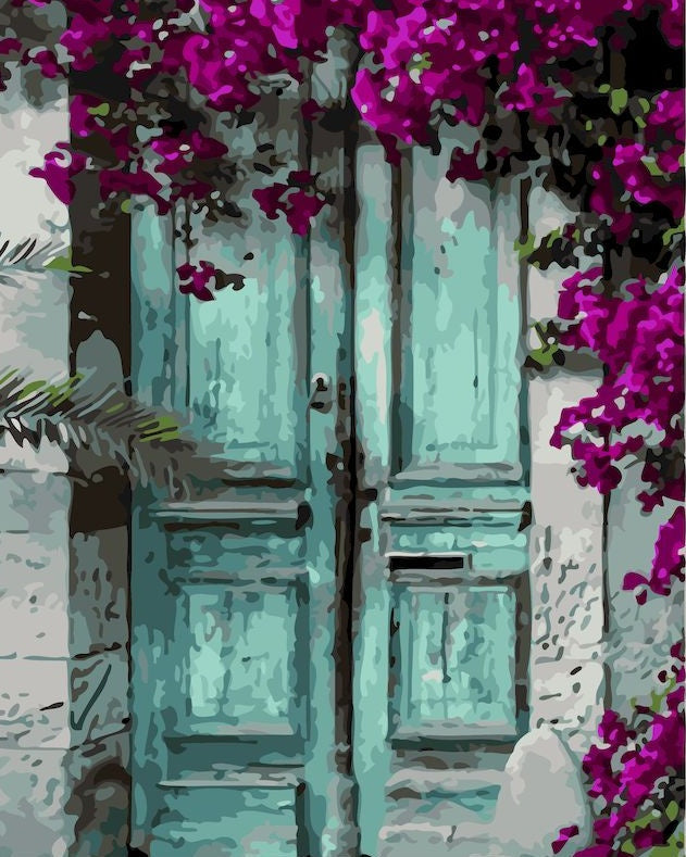 Oude Blauwe Houten Deuren en Paarse Bloemen Schilderen op Nummers