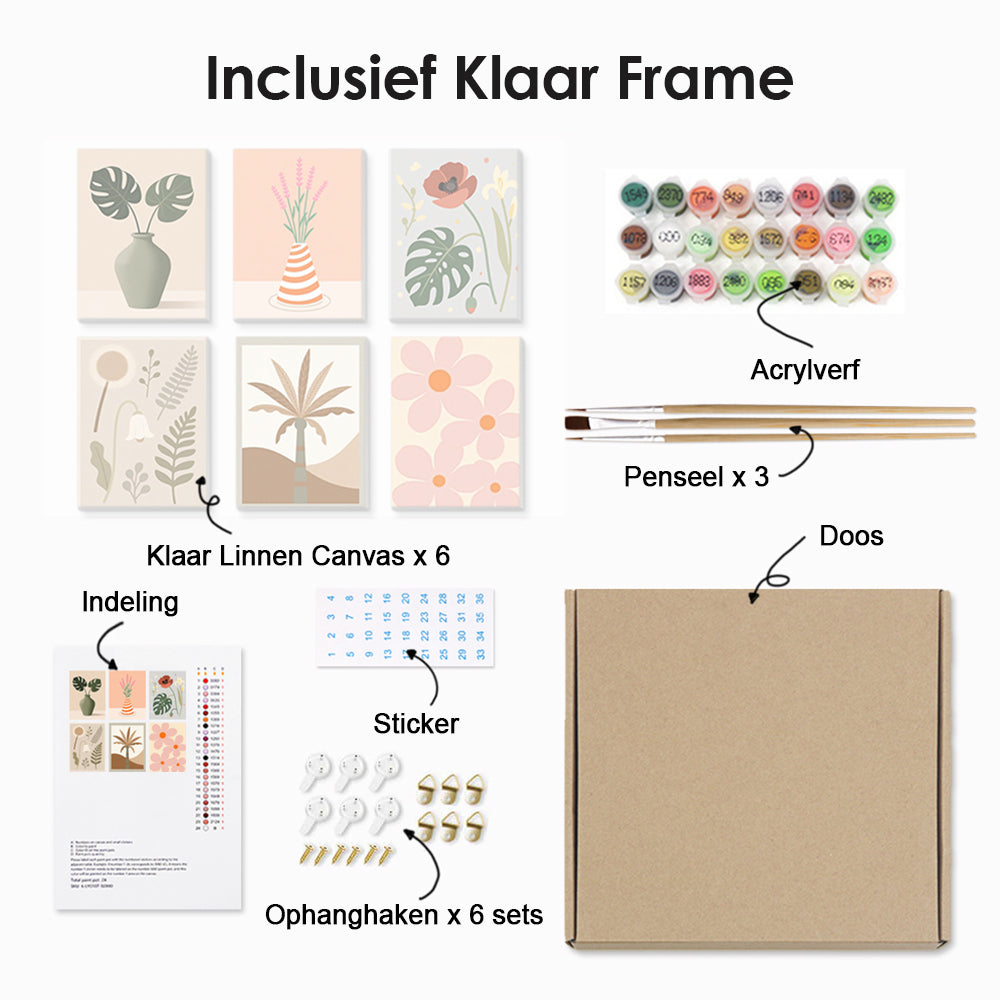 Schilderen op nummers is eenvoudig en iedereen kan het doen. Elk gebied op het canvasdoek is genummerd en komt overeen met een specifieke kleur. U hoeft de kleuren niet te mengen. U gebruikt gewoon het penseel om de juiste gebieden in te kleuren. U kunt ook zelf de volgorde van de kleuren bepalen. Uiteindelijk maak u uw eigen kunstwerk dat u met trots aan uw familie en vrienden kunt laten zien.