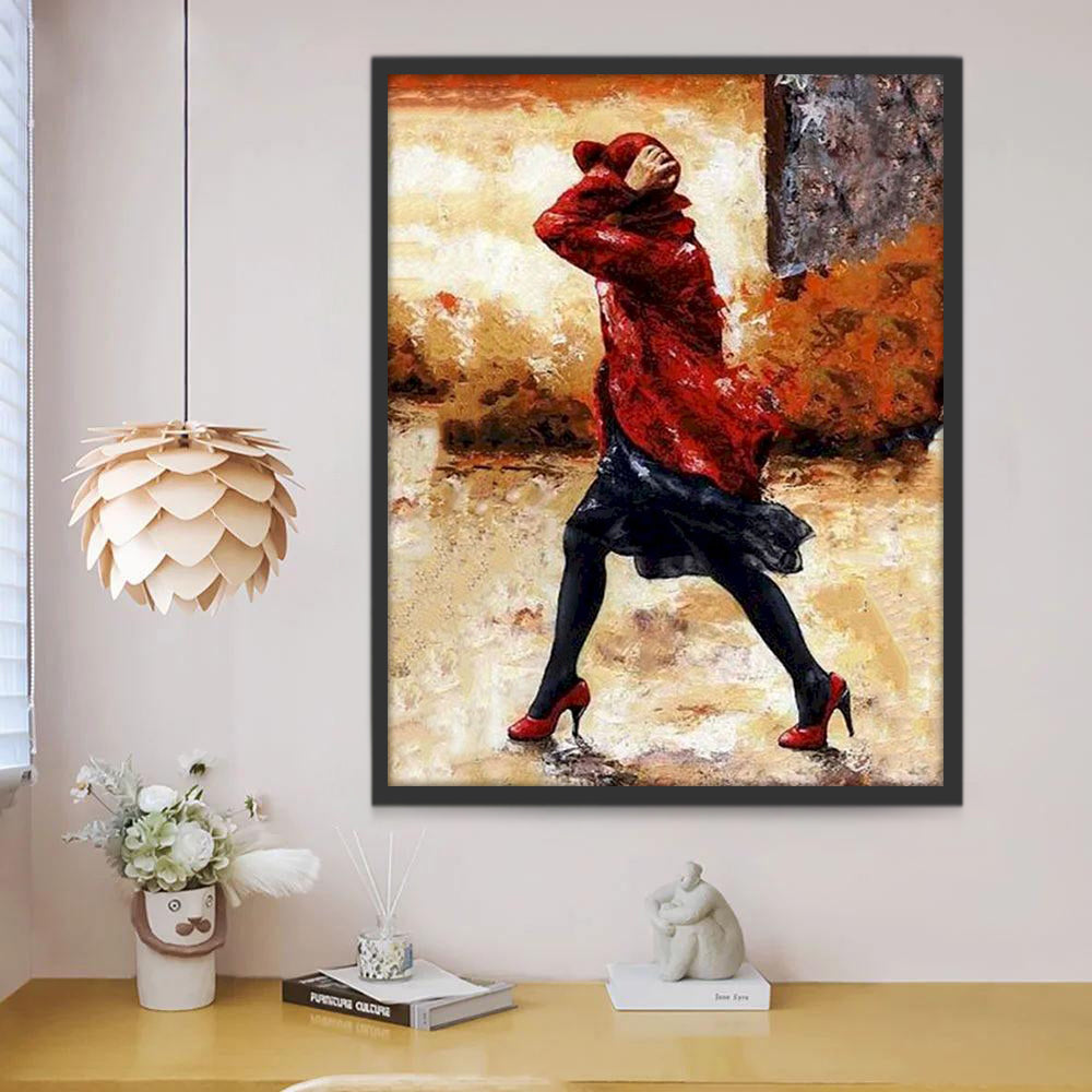 Dame in Rode Mantel op Regenachtige Straat Schilderen op Nummers