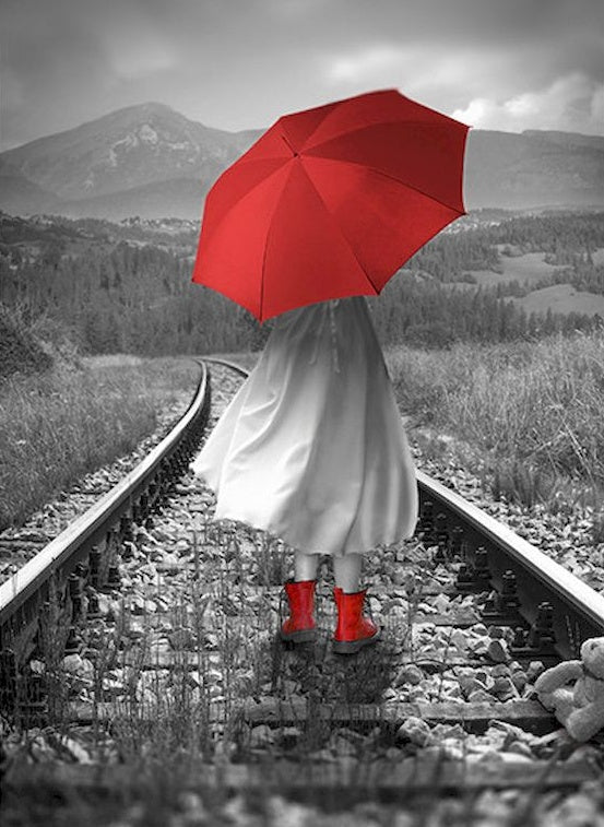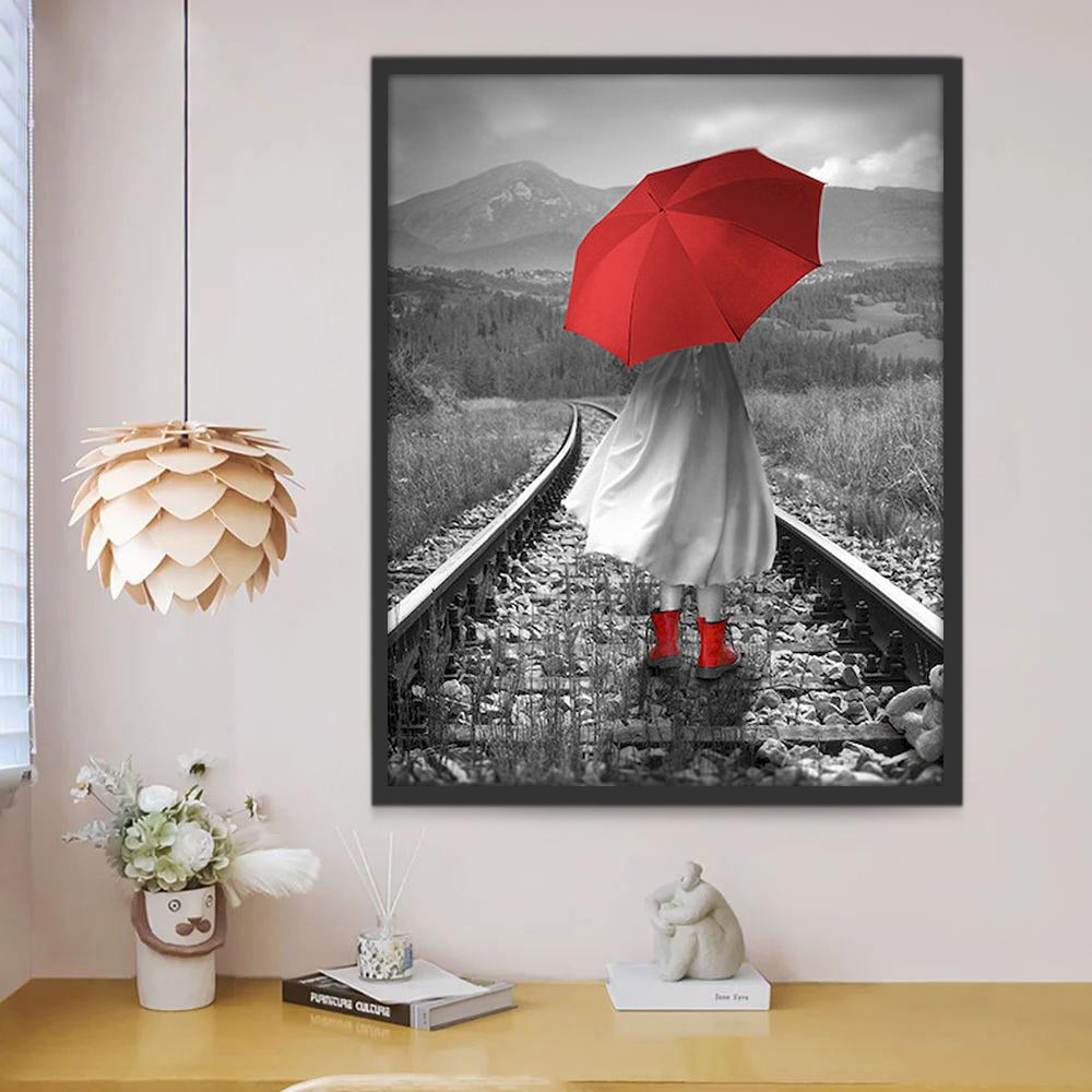 Een Rode Paraplu en Rode Schoenen in een Zwart-wit Beeld Schilderen op Nummers