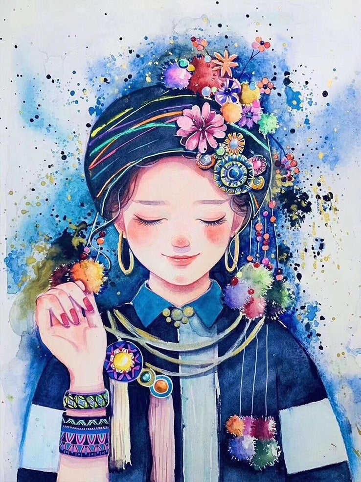 Portret van Meisje met Bloemen en Traditionele Hoofdtooi Schilderen op Nummers
