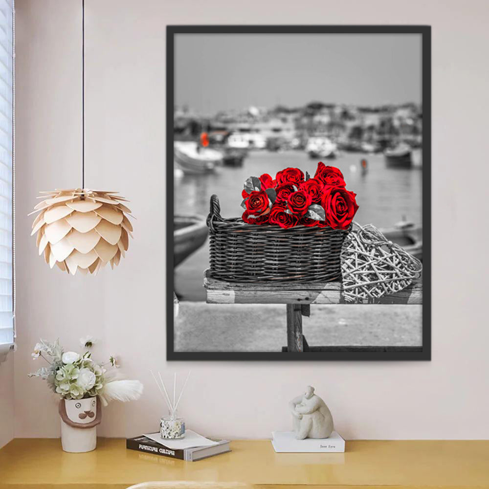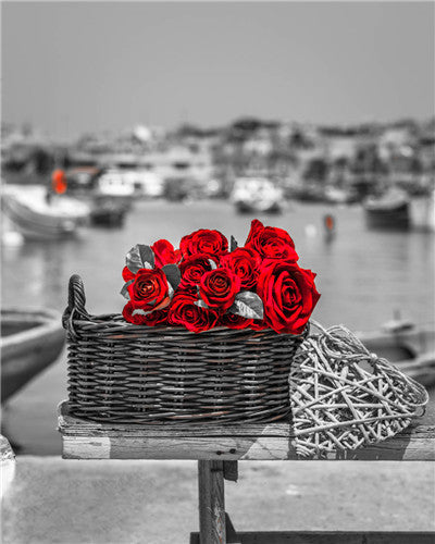 Rode Rozen en Gebreid Hart op het Bankje bij het Meer Schilderen op Nummers