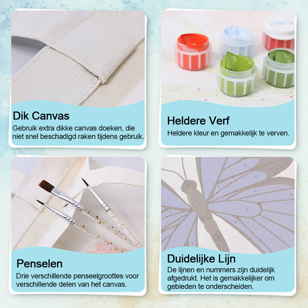 Gemakkelijk te schilderen - De set van Schilderen op nummers is gemakkelijk te gebruiken. Elk deel van het canvasdoek is genummerd en komt overeen met een kleur. Volg de instructies, schilder op nummer en maak de afbeelding af.