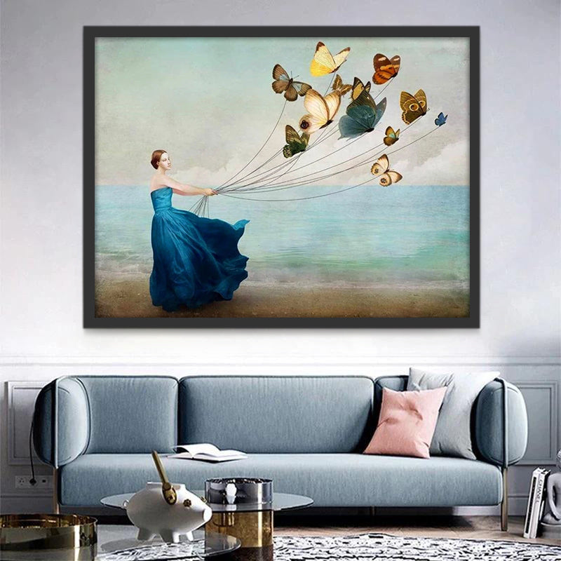 Vrouw in Blauwe Jurk met Vlinders Schilderen op Nummers