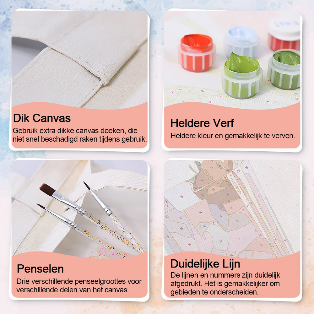 Gemakkelijk te schilderen - De set van Schilderen op nummers is gemakkelijk te gebruiken. Elk deel van het canvasdoek is genummerd en komt overeen met een kleur. Volg de instructies, schilder op nummer en maak de afbeelding af.