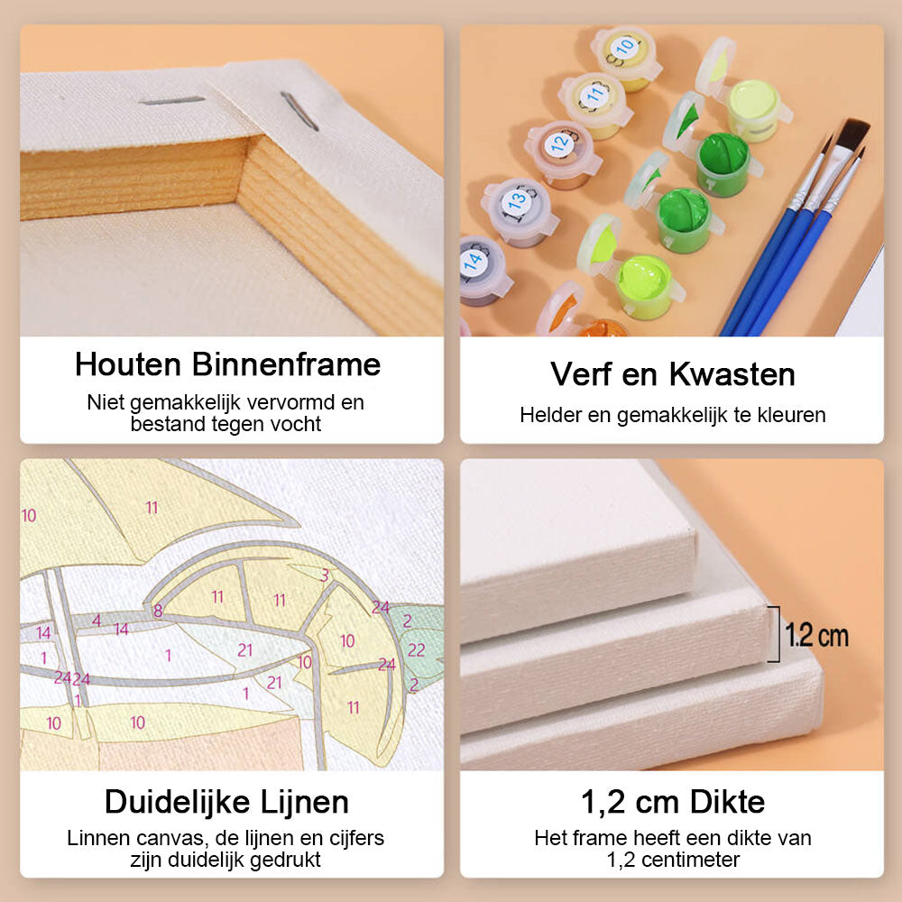 Gemakkelijk te schilderen - De set van Schilderen op nummers is gemakkelijk te gebruiken. Elk deel van het canvasdoek is genummerd en komt overeen met een kleur. Volg de instructies, schilder op nummer en maak de afbeelding af.