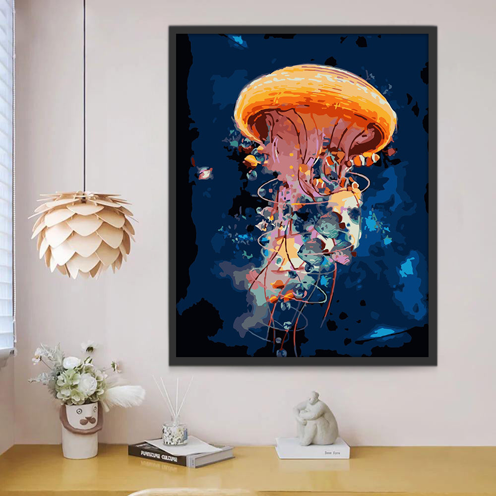 Oranjekleurige kwallen en een school vissen Schilderen op Nummers
