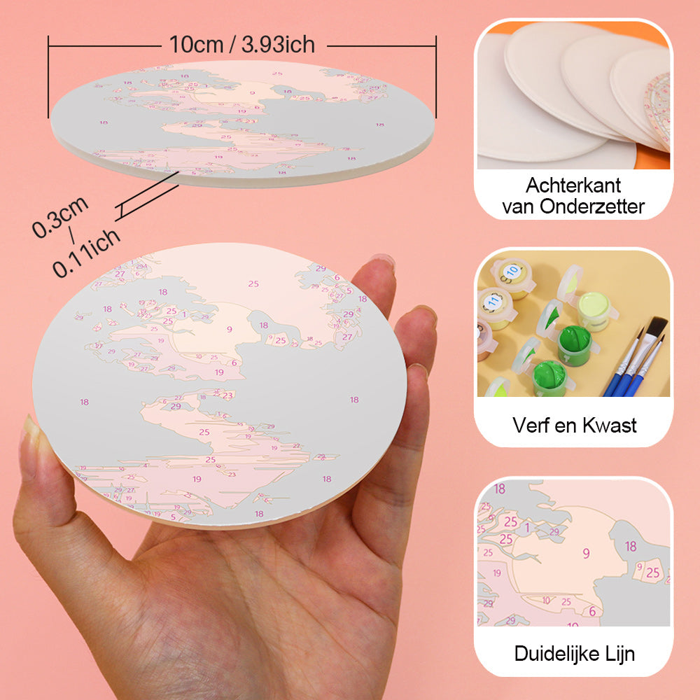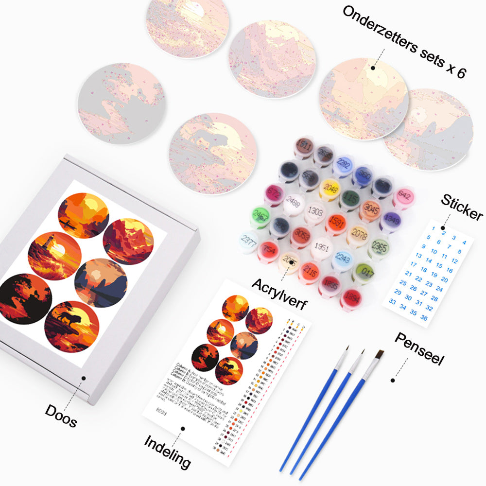 6 Stuks Zonsondergang Bergen en Vuurtoren Onderzetters Schilderen op Nummers